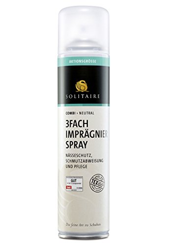 Das Imprägnierspray für Schuhe von Solitaire schützt vor Nässe, weist Schmutz ab und pflegt das Material: Vor allem im Winter und an regnerischen Tagen ist es notwendig, dass Sie Ihre Schuhe pflegen und schützen. Mit dem Aerosol Imprägnierspray für Schuhe sorgen Sie dafür, dass Leder, Textilien und Kunstfasern nicht von Wasser und Schmutz beschädigt werden. Entfernen Sie zunächst Staub und Schmutz von Ihrer Bekleidung oder von Ihren Schuhen und wenden Sie dann das Imprägnierspray für Schuhe an. Sprühen Sie das Imprägnierspray aus rund 30 Zentimetern Entfernung gleichmäßig auf Ihre Schuhe, durchnässen Sie diese jedoch nicht. Nachdem die Imprägnierung getrocknet ist, können Sie Leder nachpolieren. Das Imprägnierspray für Schuhe ist nicht für Lack- und Stretchmaterialien geeignet. Das Imprägnierspray für Schuhe von Solitaire ist in einer 200 und 400 ml Dose erhältlich.Grundpreise:200ml Variante: EUR 3,98 / 100 ml400ml Variante: EUR 2,49 / 100 ml